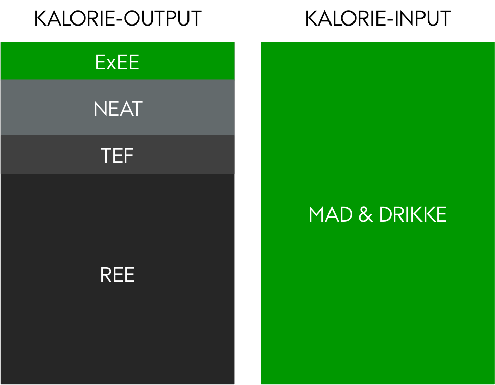 REE: Resting Energy Expenditure (hvilestofskifte), TEF: Thermic Effect of Food (energien brugt på at omsætte maden), NEAT: Non-Exercise Activity Thermogenesis (energi brugt på ikke-træningsaktivitet), ExEE: Exercise Energy Expenditure (energi brug på træning).