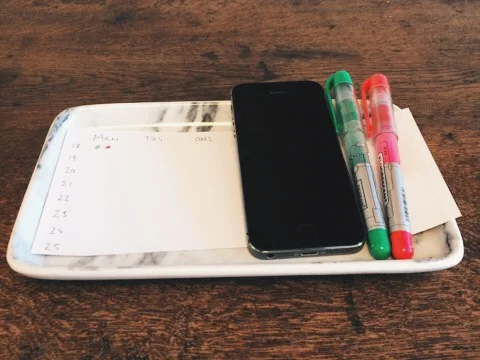 Derhjemme har vores telefoner fra og med i dag, fået deres egen plads på et lille marmorfad, på en kommode i entréen (se billedet nedenfor). Her ligger de med lyd på, så jeg kan høre hvis nogen ringer eller skriver. Der er ikke slået andre notifikationer til. De bliver ikke taget med i soveværelset om aftenen, eller med i køkkenet når jeg sætter mig derud og skriver om morgenen – dette beror i første omgang på vores fælles selvdisciplin, men jeg regner med, at det hurtigt bliver en vane at lade dem ligge. På den måde bruger jeg ikke energi på dette, lige inden jeg skal sove, lige når jeg vågner, eller på det tidspunkt af dagen, hvor jeg arbejder bedst (7-8 om morgenen).